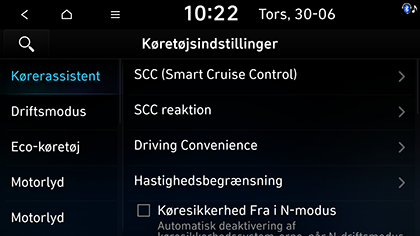 SCC (Smart Cruise Control) (hvis bilen har udstyret): Indstiller egenskaberne for fartpilot-systemet (Smart Cruise Control).