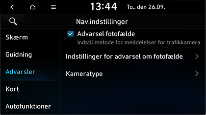 Denne menu bruges til at ændre indstillingerne for kameraadvarsel. Denne funktion er kun tilgængelig, når Bluelink er aktiveret, eller Wi-Fi-opkoblingen er tilsluttet.