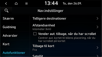 Vis tidligere destinationer, når du åbner kortskærmen: Den tidligere destination bliver vist, når du aktiverer korttilstand for første gang, efter du har tændt systemet.