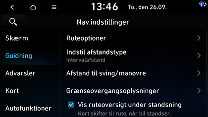Afstand til sving/manøvre: Indstiller navigationsindstillingen ud fra lokationen.