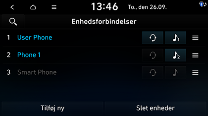 Viser en liste over parrede Bluetooth-enheder. Når du vælger fra listen er enheden enten tilsluttet eller frakoblet.