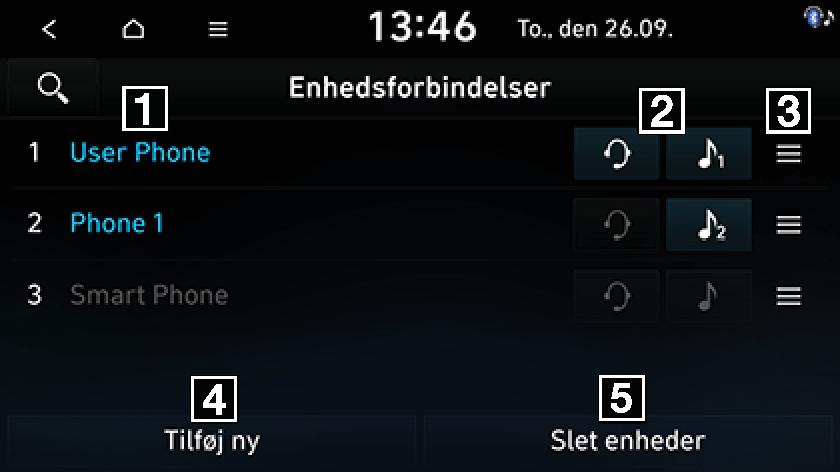 Denne menu bruges til at parre og forbinde hovedenheden og en Bluetooth-telefon.