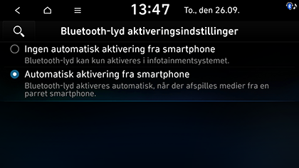 Du kan indstille Bluetooth-lyd-tilstand til at aktivere automatisk, når den tilknyttede telefon afspiller lyd. Selv når den anden tilstand er aktiveret eller alle medier-tilstand er deaktiveret, hvis du afspiller Bluetooth-lyd på din telefon, skifter medietilstanden automatisk til Bluetooth-lyd-tilstand, så du kan styre afspilningen på telefonen. Kontrollér venligst, at din telefon er parret og koblet til infotainmentsystemet, inden du indstiller.