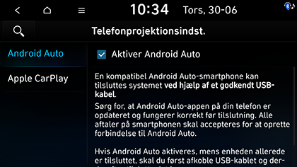 Aktiver Android Auto/Aktiver Apple CarPlay: Aktiverer telefonprojektion. Du kan betjene telefonprojektion via dette system.