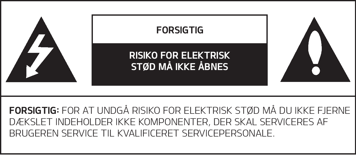 For at mindske risikoen for elektrisk stød, må du ikke fjerne dækslet eller bagsiden af dette produkt. Der findes ingen dele inde i produktet, der kan serviceres af brugeren. Overlad service til kvalificeret servicepersonale.