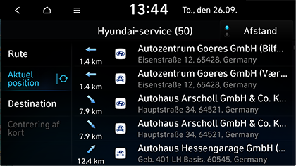 Destination: Søger efter Hyundai-servicer i nærheden af den nuværende destination. Er kun tilgængelig, når destinationen er indstillet.