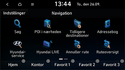 Du kan indstille en destination ved at bruge genvejsknappen. Tryk på NAV og vælg den ønskede lokation fra knappen Hjem, Kontor, Favorit 1, Favorit 2 eller Favorit 3 nederst på skærmen.