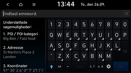 Indtast et søgeord som fx POI, POI-kategori, adresse eller koordinater, og tryk på OK.