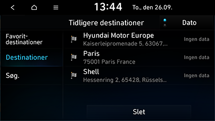 Tryk på Slet for at slette de tidligere destinationer. Vælg det ønskede emne, og tryk derefter på Slet.