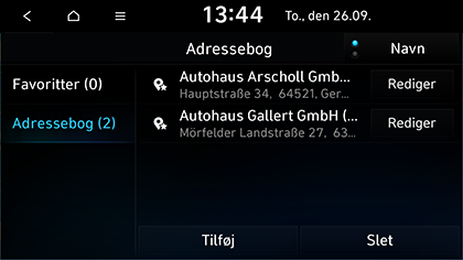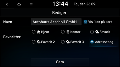Tryk på NAV > Adressebog > Favoritter og det ønskede element for at gemme lokationen. Eller tryk på NAV > Adressebog > Adressebog > Tilføj.