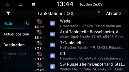 Rute: Søger efter Hyundai-servicer langs den nuværende rute. Er kun tilgængelig, når destinationen er indstillet.