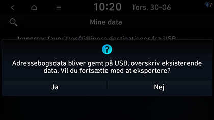 Tryk på SETUP > Navigation > Autofunktioner > Mine data > Eksp. fav./tidl. dest. t. USB.