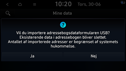 Denne funktion bruges til at importere adressebogen fra en USB-hukommelsesenhed.