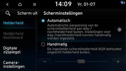 Digitale zijspiegel (indien aanwezig): Stelt de helderheid van de digitale zijspiegels van de bestuurder en de passagier in.