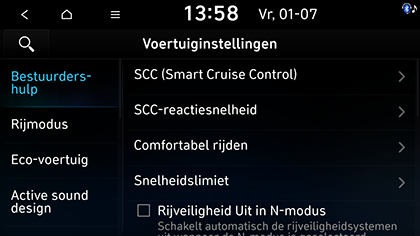 SCC (Smart Cruise Control) (Indien van toepassing): Stelt de eigenschappen van het SCC-systeem (Smart Cruise Control) in.