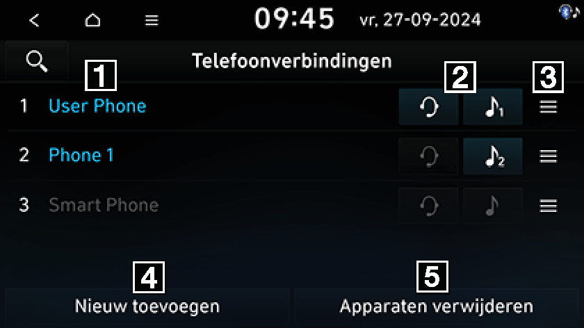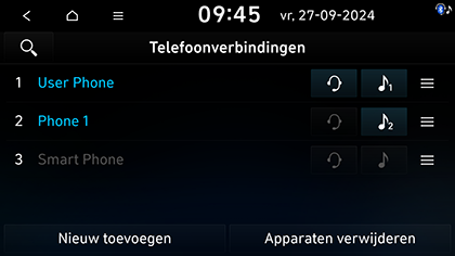 Geeft de gekoppelde Bluetooth apparatenlijst weer. Door te selecteren uit de lijst, wordt het apparaat verbonden of wordt de verbinding verbroken.