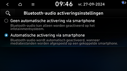 Je kunt de Bluetooth-audiomodus instellen op automatisch activeren wanneer de aangesloten telefoon audio afspeelt. Zelfs wanneer een andere modus is geactiveerd of de mediamodus is afgesloten, zal de mediamodus naar de Bluetooth-audiomodus overschakelen wanner u Bluetooth-audio op uw telefoon afspeelt, zodat u het afspelen op uw telefoon kunt bedienen. Controleer of uw telefoon gekoppeld is aan het infotainment-systeem alvorens het instellen.