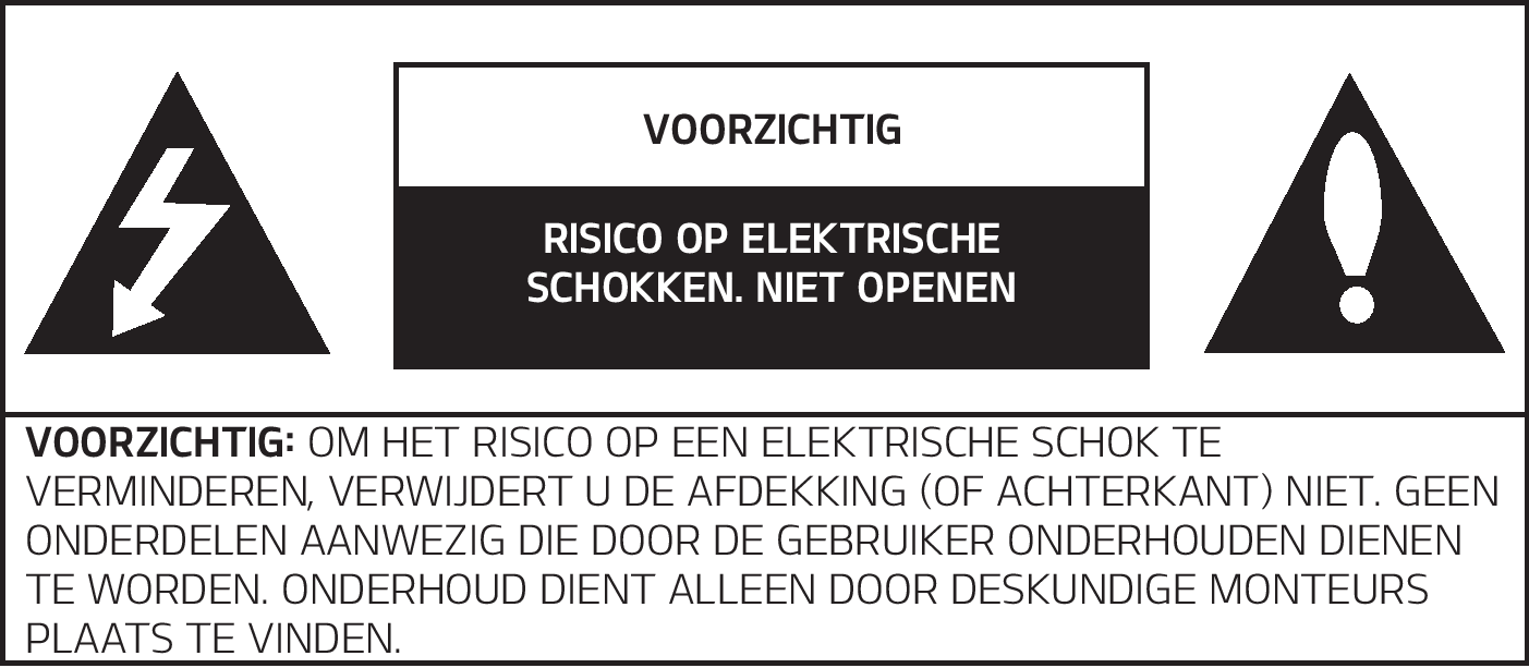 De bliksemflits met de kop van een pijl binnen een gelijkzijdige driehoek is bestemd om de gebruiker te wijzen op de aanwezigheid van niet-geïsoleerde, gevaarlijke spanning binnenin de productbehuizing die voldoende krachtig kan zijn om een risico op een elektrische schok te vormen.