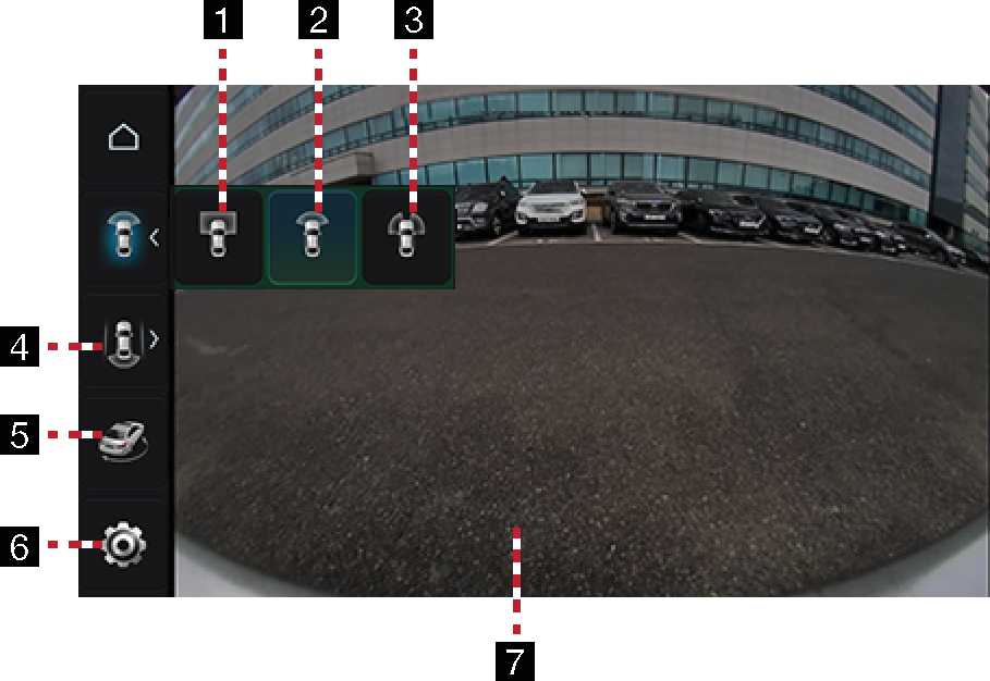 (Weergave rijondersteuning)Het geeft het beeld achteraan boven weer via de achteruitrijcamera terwijl u rijdt. (Als de versnelling in de stand R wordt gezet, wordt deze uitgeschakeld)