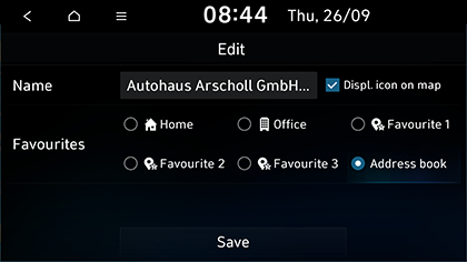 Save location: salvestab selle asukoha Address book. Liigub aadressiraamatu redigeerimisekraanile.