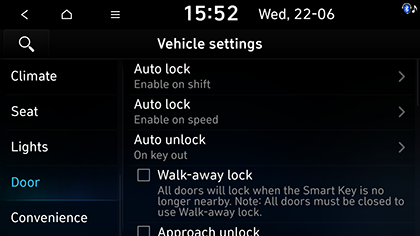 Auto unlock: saate valida, millal automaatne lukustusfunktsioon uksed lukust avab. Saate valida On key out, On shift to P, On vehicle Off või Off.