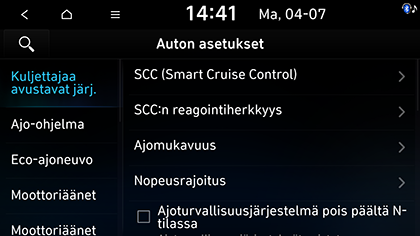 Valitse SETUP > Auto > Kuljettajan avustus-järjestelmät.
