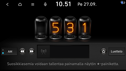 Paina DAB/FM tai FM vaihtaaksesi taajuusalueen AM-radioon, jos taajuusalue on asetettu DAB(jos varusteena)/FM-radioon. Viimeksi kuuntelemasi asema näytetään.
