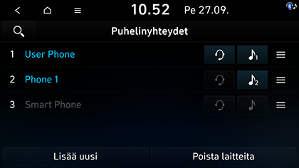 Näyttää luettelon Bluetooth-laitteista, jotka ovat laiteparina. Laite joko yhdistetään tai yhteys katkaistaan, kun laite valitaan luettelosta.