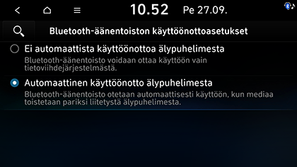 Voit asettaa Bluetooth-äänitilan aktivoitumaan automaattisesti, kun yhdistetystä puhelimesta toistetaan ääntä. Riippumatta siitä, onko jokin muu tila valittuna tai onko kaikki mediatilat poistettu käytöstä, Bluetooth-äänentoiston aloittaminen puhelimella vaihtaa mediatilan automaattisesti Bluetooth-äänitilaan. Näin voit ohjata toistoa suoraan puhelimesta. Tarkista ennen asetusten tekemistä, että puhelin on pariliitetty ja yhdistetty infotainment-järjestelmään.