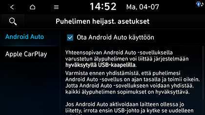 Tässä valikossa voi ottaa käyttöön Android Auto- tai Apple CarPlay -asetuksen valitsemalla sen valintaruudun.