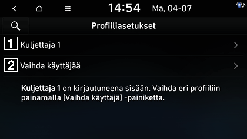 Poista profiili Driver1, Driver2, Guest: Poistaa nykyisen kuljettajaprofiilin.