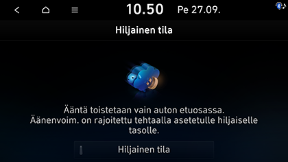Tässä tilassa radio ja media toistuvat vain etuistuimessa. Ota hiljainen tila käyttöön valitsemalla Hiljainen tila. Poista tila käytöstä valitsemalla komento uudelleen.