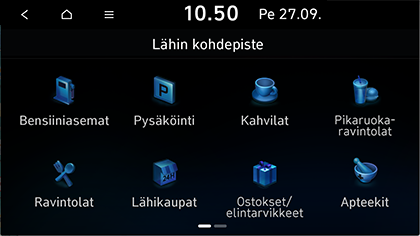 Määränpää: etsii POI-kohteita auton nykyisen määränpään läheltä. Käytettävissä vain, kun määränpää on asetettu.