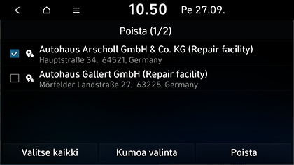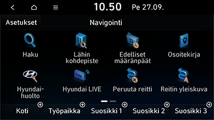 Määränpää: etsii nykyisen määränpään lähellä olevia Hyundai-palveluja. Käytettävissä vain, kun määränpää on asetettu.