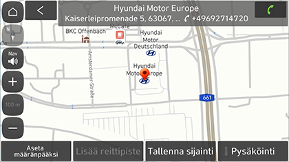 Kartan keskipiste: etsii Hyundai-palveluja vieritysmerkin ympäriltä. Käytettävissä vain, kun karttanäyttöä vieritetään.