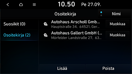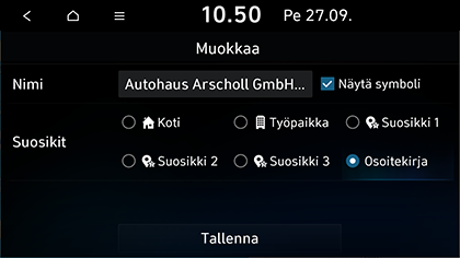 Paina NAV > Osoitekirja > Suosikit ja haluttua kohtaa tallentaaksesi sijainnin. Tai paina NAV > Osoitekirja > Osoitekirja > Lisää.