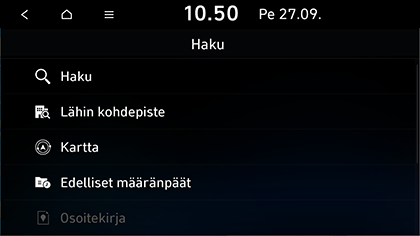 Voit etsiä määränpään eri valikoiden avulla. Jotkin valikot ovat käytettävissä vain, kun navigointijärjestelmä on yhteydessä matkapuhelinverkkoon. Joitakin kuvien kohteita voivat poiketa todellisesta näkymästä mallin, vaihtoehdon ja maan mukaan.