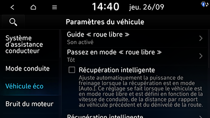 Guide « roue libre »: Les conseils de ralentissement aident le conducteur à faire des économies de carburant en lui recommandant quand retirer son pied de la pédale d'accélérateur. Vous pouvez sélectionner Son activé ou Son désactivé.