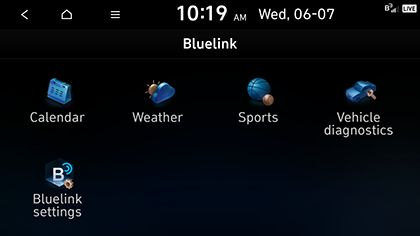 Utiliza as funcións de Bluelink como Calendario, Meteoroloxía, Deportes, Diagnóstico do vehículo e Configuración de Bluelink. Para utilizar as funcións de Bluelink, cómpre activar o servizo previamente. Pode que se cobre unha tarifa adicional polo emprego de Bluelink e as funcións poden variar segundo o seu plan de servizos.