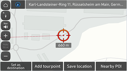 Manteña premido o punto do mapa e móvao ata o punto desexado. Sólteo cando o punto desexado estea centrado. O punto seleccionado centrarase na pantalla e mostrarase a marca de desprazamento. A información sobre o punto marcado e a distancia en liña recta desde a localización actual mostraranse no centro da pantalla.