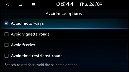 Prema Avoidance options. Marque ou desmarque a opción de ruta que quere evitar e prema [