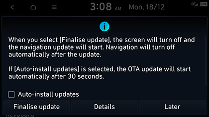 Cando a batería do vehículo estea por debaixo dun determinado nivel, a opción Finalise update desactivarase e a actualización do sistema non estará dispoñible.