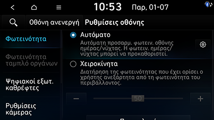 Ψηφιακοί εξωτ. καθρέφτες (εάν υπάρχει): Ρυθμίζει τη φωτεινότητα των ψηφιακών πλαϊνών καθρεφτών οδηγού και συνοδηγού.