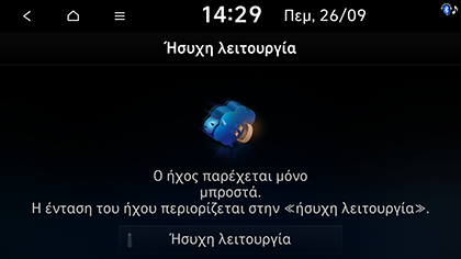 Σε αυτή τη λειτουργία το ραδιόφωνο/πολυμέσα αναπαράγονται μόνο στο εμπρός κάθισμα. Για να ενεργοποιήσετε τη λειτουργία ησυχίας, πατήστε Ήσυχη λειτουργία. Πατήστε ξανά για απενεργοποίηση.