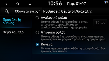Προφύλαξη οθόνης: Επιλέγει προστασία οθόνης. Μπορείτε να επιλέξετε Αναλογικό ρολόι, Ψηφιακό ρολόϊ ή Κανένα για την εικόνα προστασίας οθόνης.