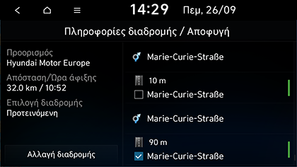 Πληροφ. διαδρομής/Επιλογές: Εμφανίζει τις πληροφορίες διαδρομής και τον δρόμο που μπορείτε να επιλέξετε να αποφύγετε.