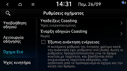 Coasting: Η λειτουργία Eco coasting βοηθά στην εξοικονόμηση καυσίμου επιλέγοντας αυτόματα τη νεκρά (N) κατά την κύλιση χωρίς γκάζι. Όταν ενεργοποιείται η λειτουργία Eco coasting θα εμφανιστεί η ένδειξη Coasting.