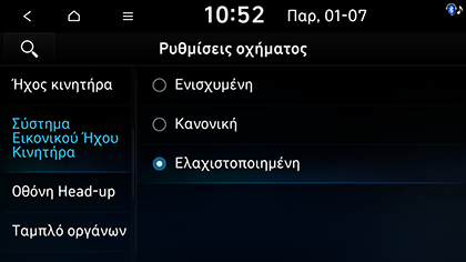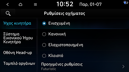 Επιλέξτε τα στοιχεία που θέλετε. Μπορείτε να ρυθμίσετε τη λειτουργία ήχου κινητήρα σε Ενισχυμένη, Κανονική, Ελαχιστοποιημένη, ή Κλειστό.