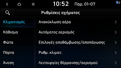Θέρμανση/αερισμός καθισμάτων βάσει των ρυθμίσεων κλιματισμού: Η θέρμανση και ο αερισμός καθίσματος και η θέρμανση τιμονιού ενεργοποιούνται αυτόματα για τη διατήρηση της άνεσης του οδηγού. Επιλέξτε τα στοιχεία που επιθυμείτε να προσαρμόσετε.