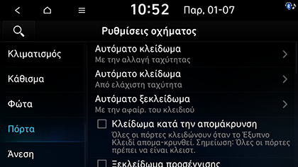 Αυτόματο κλείδωμα: Ορίζει τη συνθήκη για το αυτόματο κλείδωμα όλων των θυρών. Μπορείτε να επιλέξετε μεταξύ Από ελάχιστη ταχύτητα, Με την αλλαγή ταχύτητας, Ενεργοποίηση κατά την αλλαγή ταχύτητας σε R, N ή D, ή Κλειστό.